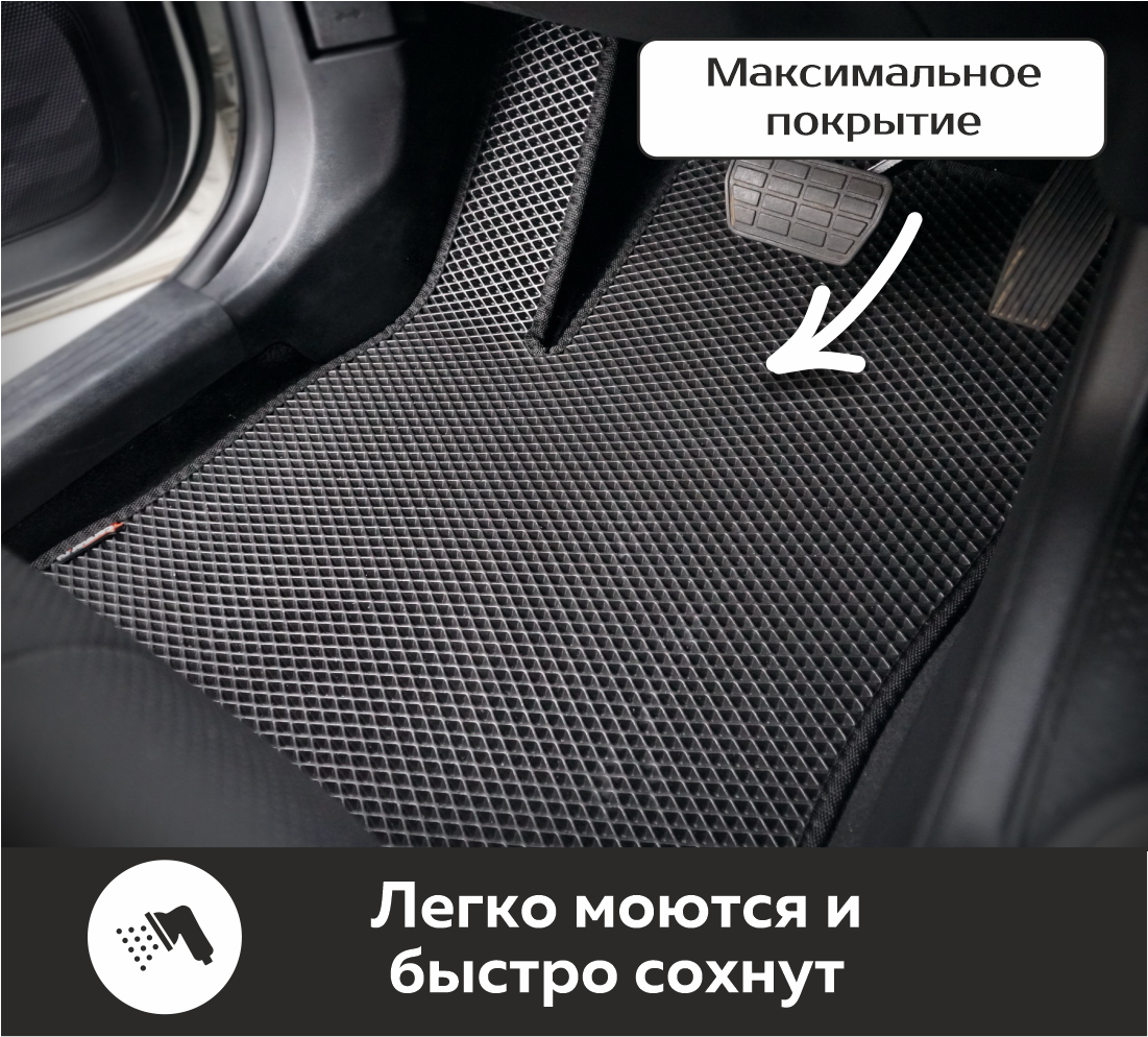 Изделия EVA имеют специальную ячеистую структуру (ячейки глубиной 8 мм), которая эффективно задерживает грязь и воду, оставляя вашу обувь и поверхность обивки салона или багажника абсолютно чистыми. Также эти ячейки очень легко и быстро очищаются без применения специальных инструментов, в том числе, при помощи бесконтактной мойки.