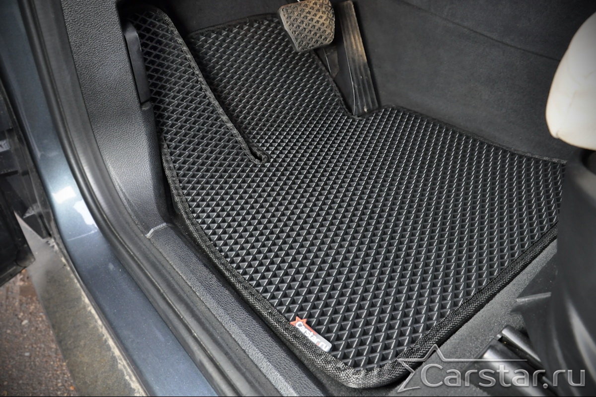 Толщина ковриков EVA составляет 10-12 мм. Глубина ячеек 7-8 мм. Такая толщина ковриков позволяет им служить довольно долго, не протираясь до 3 лет. А благодаря такой глубине ячеек коврик EVA площадью 1 кв.м. способен захватить около 3,5 л жидкости, сохраняя в чистоте вашу обувь и обивку салона.