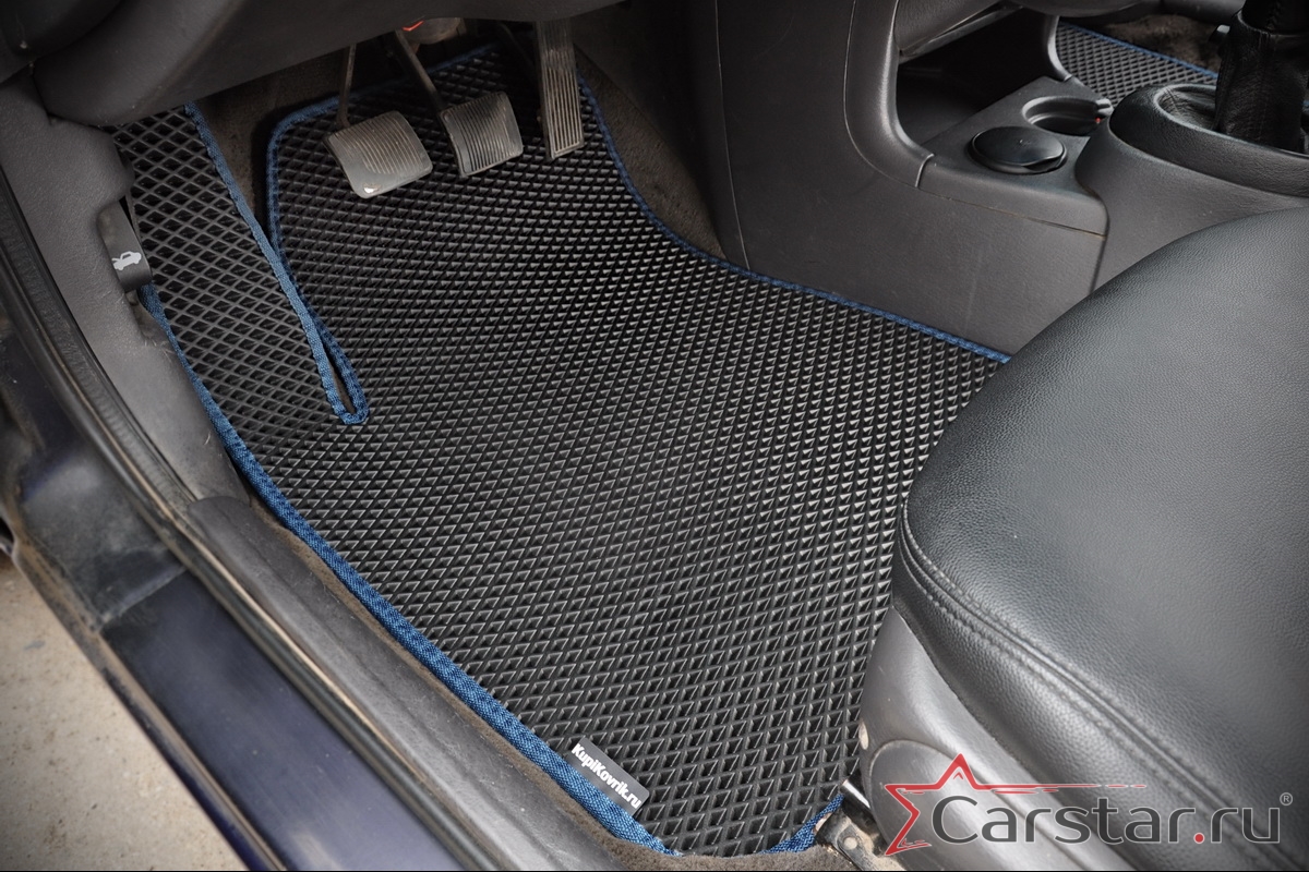 Толщина ковриков EVA составляет 10-12 мм. Глубина ячеек 7-8 мм. Такая толщина ковриков позволяет им служить довольно долго, не протираясь до 3 лет. А благодаря такой глубине ячеек коврик EVA площадью 1 кв.м. способен захватить около 3,5 л жидкости, сохраняя в чистоте вашу обувь и обивку салона.