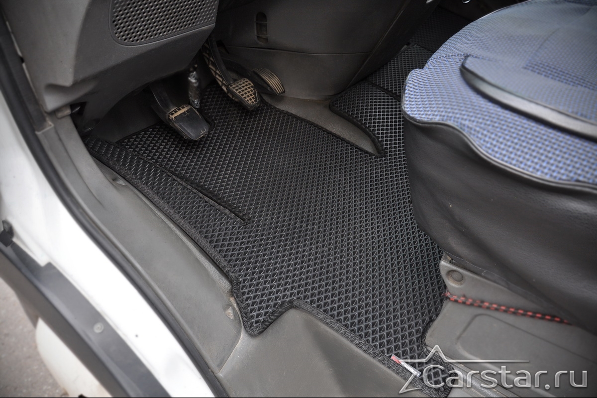 Толщина ковриков EVA составляет 10-12 мм. Глубина ячеек 7-8 мм. Такая толщина ковриков позволяет им служить довольно долго, не протираясь до 3 лет. А благодаря такой глубине ячеек коврик EVA площадью 1 кв.м. способен захватить около 3,5 л жидкости, сохраняя в чистоте вашу обувь и обивку салона.