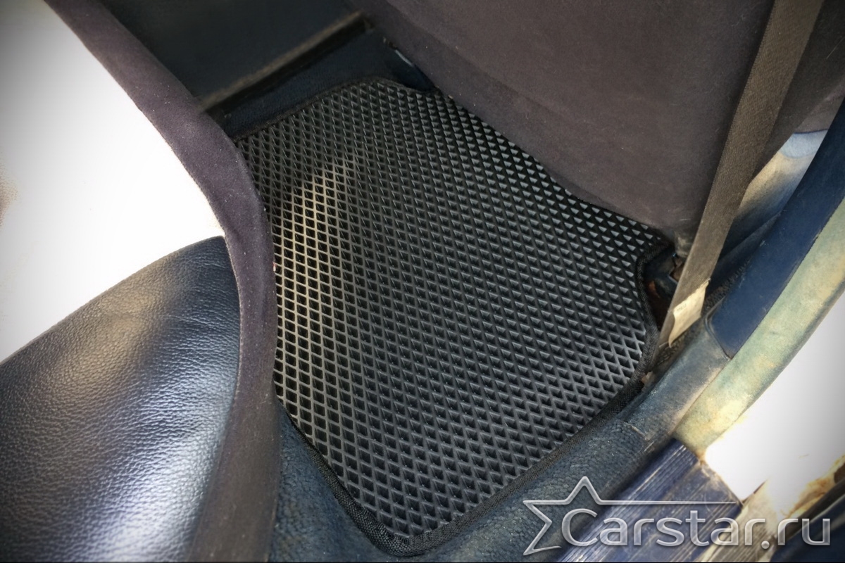 Толщина ковриков EVA составляет 10-12 мм. Глубина ячеек 7-8 мм. Такая толщина ковриков позволяет им служить довольно долго, не протираясь до 3 лет. А благодаря такой глубине ячеек коврик EVA площадью 1 кв.м. способен захватить около 3,5 л жидкости, сохраняя в чистоте вашу обувь и обивку салона.