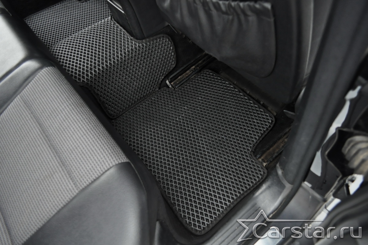Толщина ковриков EVA составляет 10-12 мм. Глубина ячеек 7-8 мм. Такая толщина ковриков позволяет им служить довольно долго, не протираясь до 3 лет. А благодаря такой глубине ячеек коврик EVA площадью 1 кв.м. способен захватить около 3,5 л жидкости, сохраняя в чистоте вашу обувь и обивку салона.