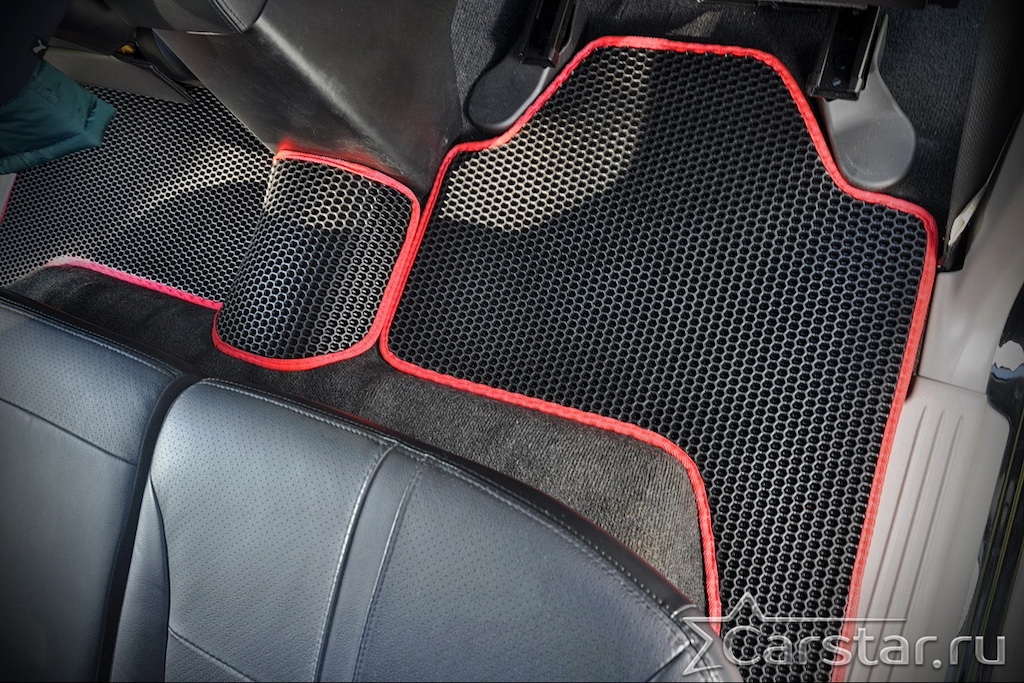 Толщина ковриков EVA составляет 10-12 мм. Глубина ячеек 7-8 мм. Такая толщина ковриков позволяет им служить довольно долго, не протираясь до 3 лет. А благодаря такой глубине ячеек коврик EVA площадью 1 кв.м. способен захватить около 3,5 л жидкости, сохраняя в чистоте вашу обувь и обивку салона.