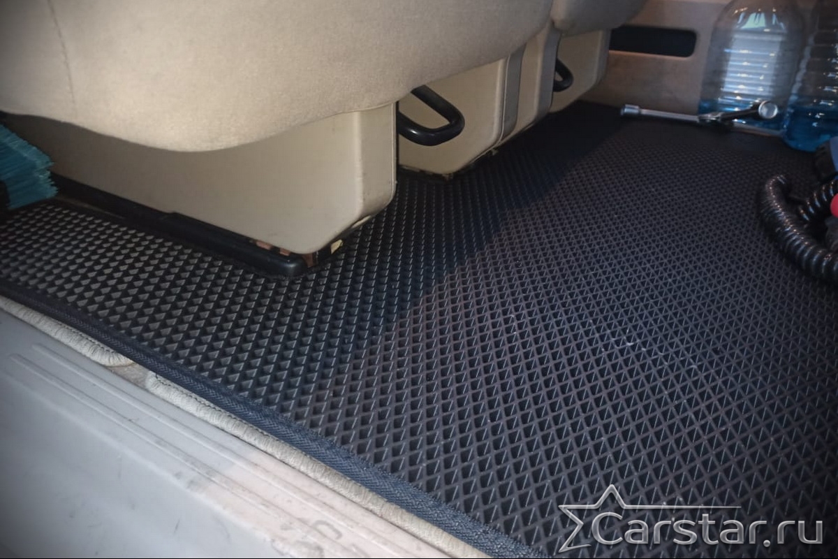 Толщина ковриков EVA составляет 10-12 мм. Глубина ячеек 7-8 мм. Такая толщина ковриков позволяет им служить довольно долго, не протираясь до 3 лет. А благодаря такой глубине ячеек коврик EVA площадью 1 кв.м. способен захватить около 3,5 л жидкости, сохраняя в чистоте вашу обувь и обивку салона.