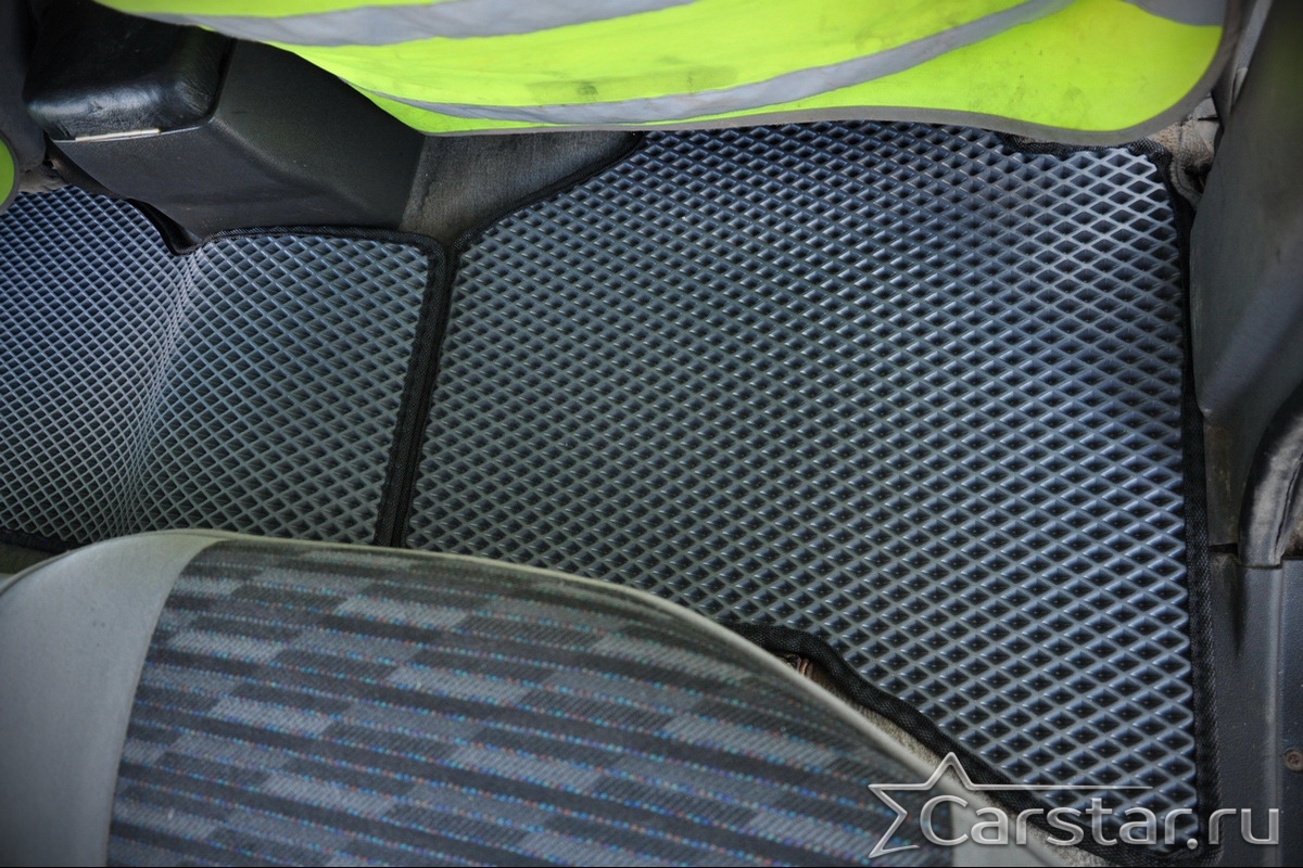 Толщина ковриков EVA составляет 10-12 мм. Глубина ячеек 7-8 мм. Такая толщина ковриков позволяет им служить довольно долго, не протираясь до 3 лет. А благодаря такой глубине ячеек коврик EVA площадью 1 кв.м. способен захватить около 3,5 л жидкости, сохраняя в чистоте вашу обувь и обивку салона.