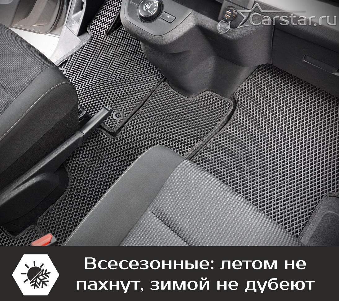 Коврики EVA всесезонные. Их можно использовать зимой, так как они не трескаются на морозе и остаются пластичными до -50 °С. А также летом, так как они не выделяют запаха на жаре до +50 °С. Зимой коврики спокойно выдерживают контакт с дорожными реагентами. Материал абсолютно непромокаемый. Ячеистая структура коврика эффективно собирает снег, грязь, песок, пыль круглый год.