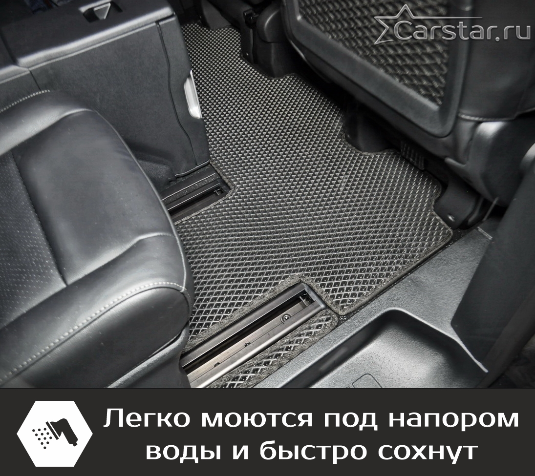 Изделия EVA имеют специальную ячеистую структуру (ячейки глубиной 8 мм), которая эффективно задерживает грязь и воду, оставляя вашу обувь и поверхность обивки салона или багажника абсолютно чистыми. Также эти ячейки очень легко и быстро очищаются без применения специальных инструментов, в том числе, при помощи бесконтактной мойки.