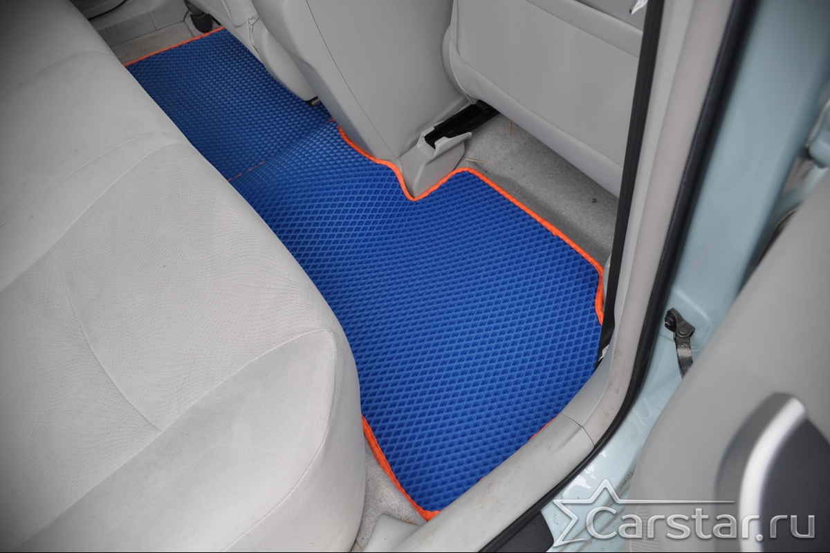 Толщина ковриков EVA составляет 10-12 мм. Глубина ячеек 7-8 мм. Такая толщина ковриков позволяет им служить довольно долго, не протираясь до 3 лет. А благодаря такой глубине ячеек коврик EVA площадью 1 кв.м. способен захватить около 3,5 л жидкости, сохраняя в чистоте вашу обувь и обивку салона.